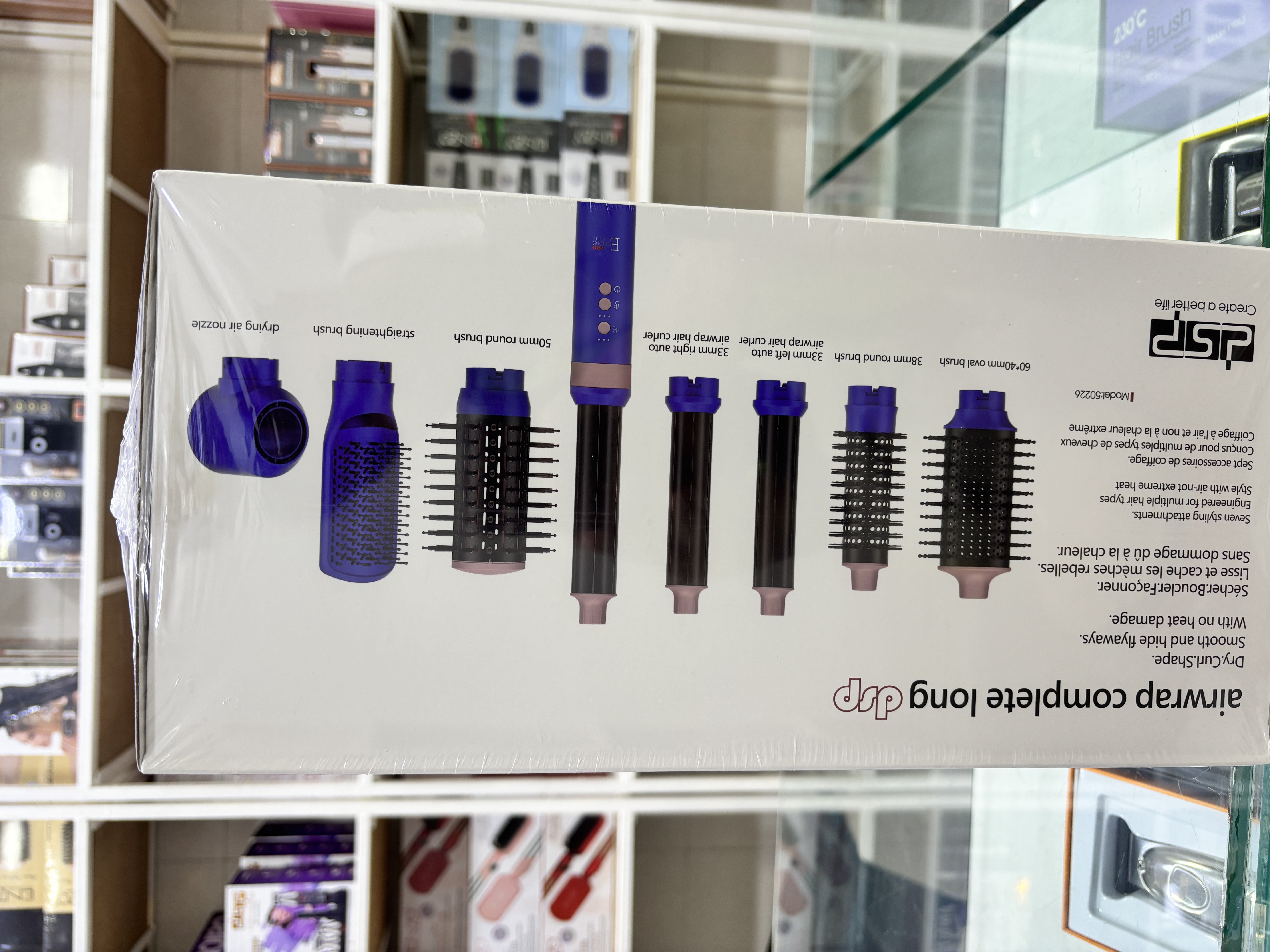 امکانات ابزار: دو عدد کرلی چپ و راست، شونه ۵۰ میل ، شونه ۳۸ میل، برس حرارتی،سری متمرکز کننده،برس بیضی شکل